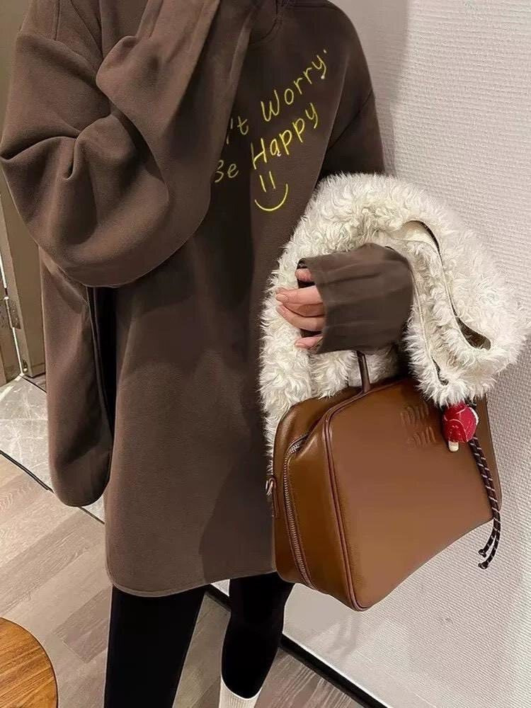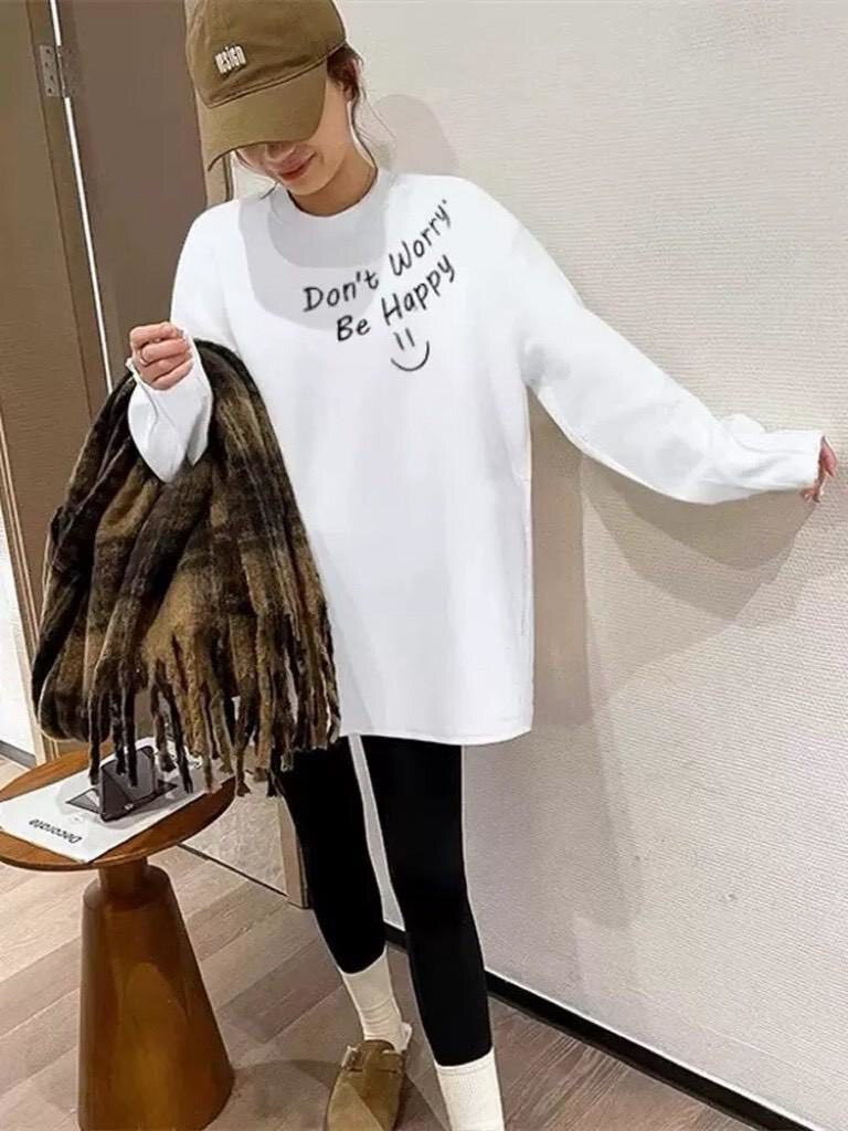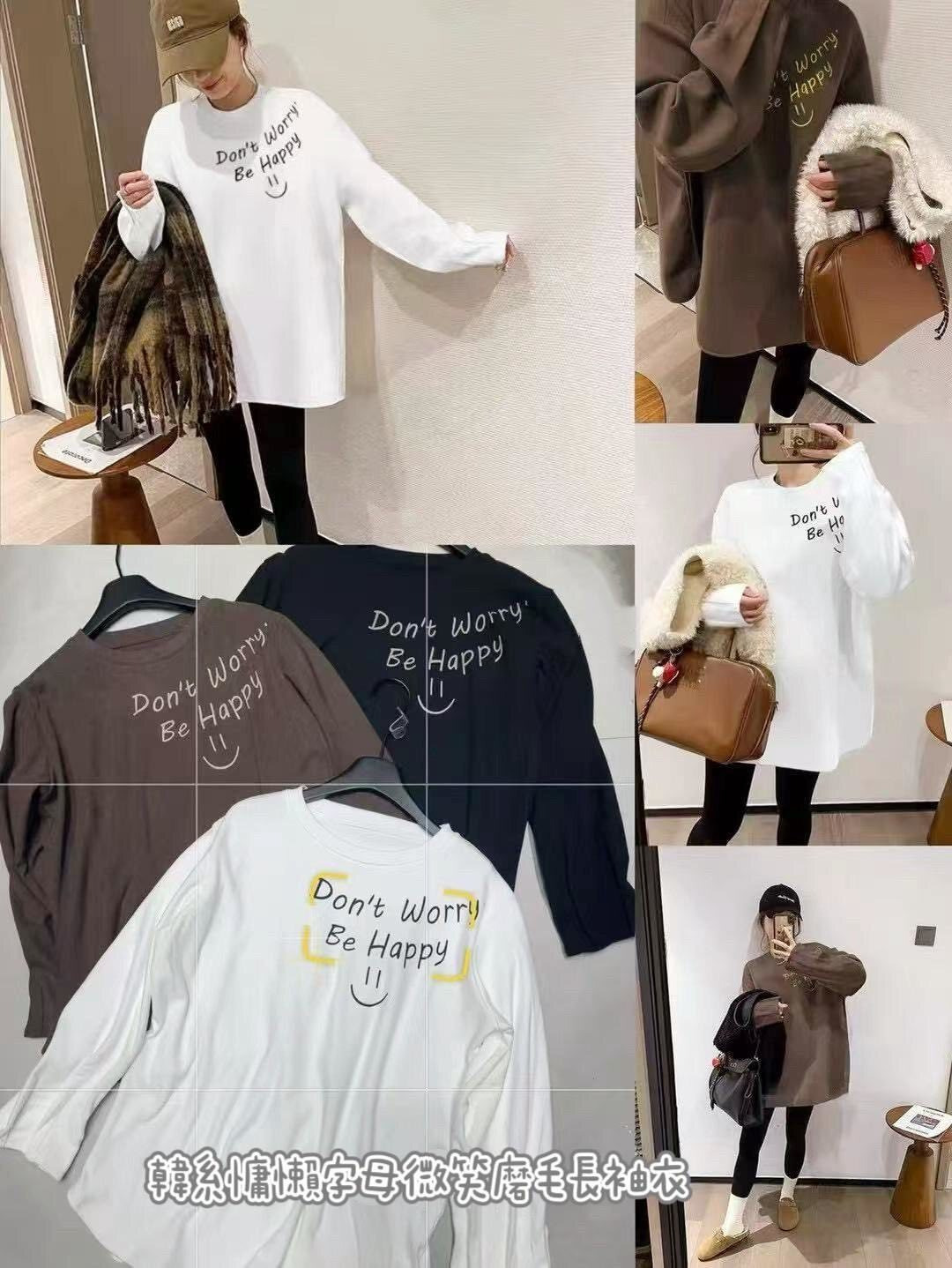 胸前手寫風字母「Don’t worry, Be happy」搭配笑臉